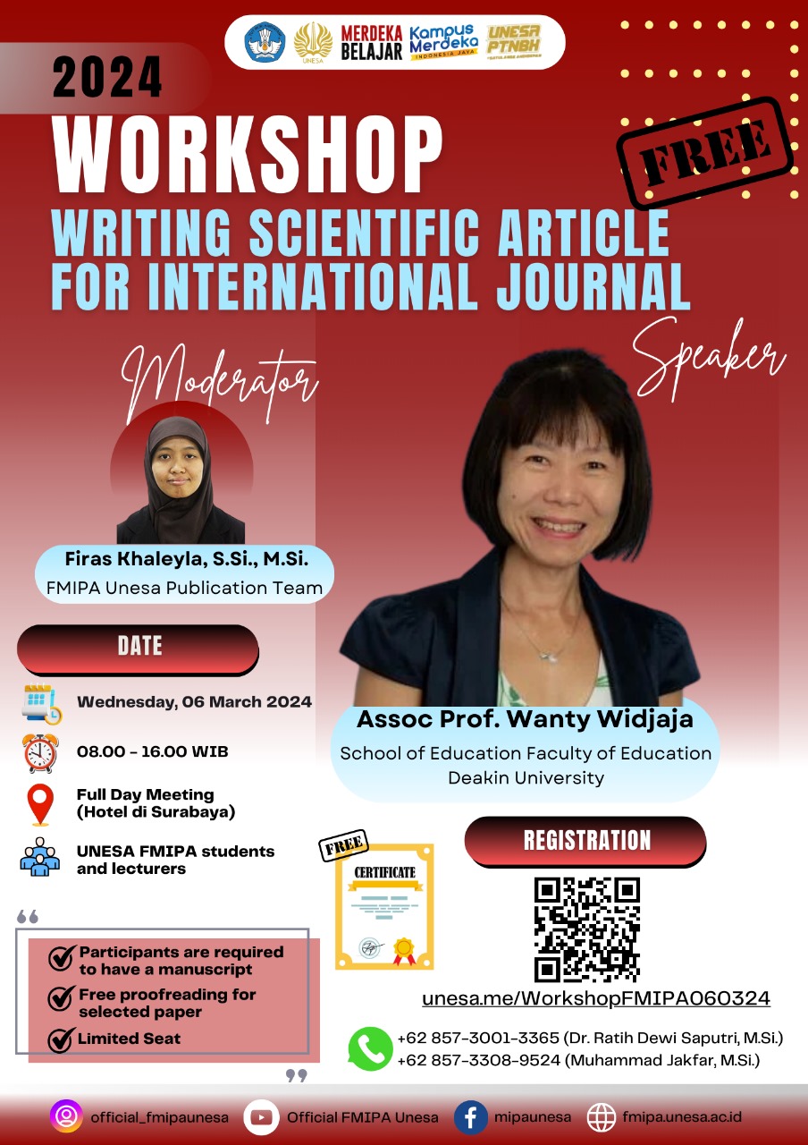 Fakultas Matematika dan Ilmu Pengetahuan Alam Universitas Negeri Surabaya mengadakan workshop penulisan artikel ilmiah untuk jurnal internasional tahun 2024 yang dilaksanakan pada hari Senin tanggal 4 Maret 2024 untuk mahasiswa S3 Pendidikan Matematika di Gedung Pascasarjana C1 Kampus Ketintang pukul 09.00-12.00 dan juga hari Rabu tanggal 6 Maret 2024 mahasiswa pascasarjana FMIPA Unesa. Narasumber yang memberikan materi adalah Assoc Prof. Wanty Widjaja dari School of Education fakultas pendidikan Deakin University, Australia.Kegiatan ini dilaksanakan di The Southern Hotel, Surabaya, Indonesia. Workshop Penulisan Artikel ini dilakukan untuk membantu mahasiswa dan dosen dalam menyusun artikel terindeks scopus di FMIPA Universitas Negeri Surabaya.