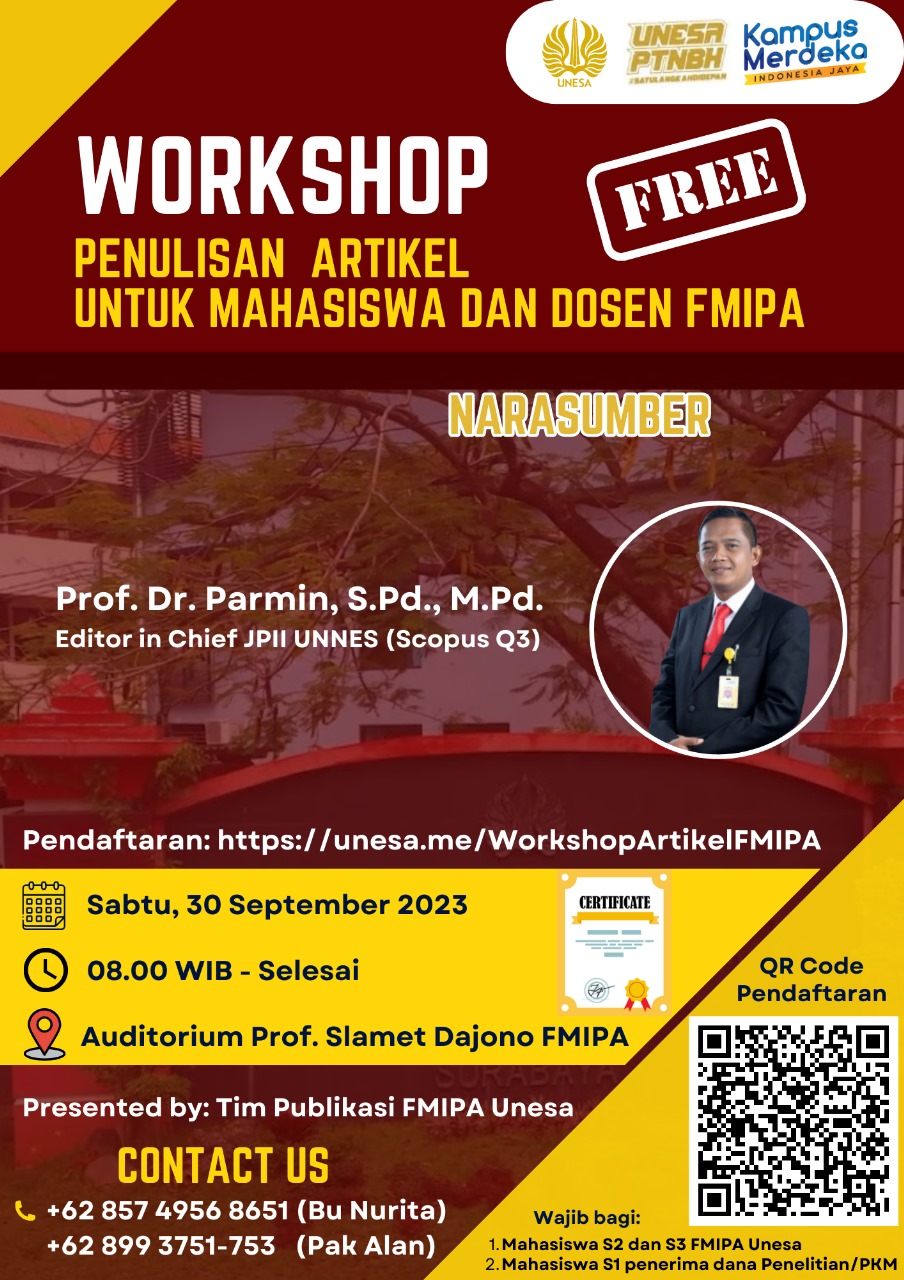 Workshop Penulisan Artikel untuk Mahasiswa dan Dosen FMIPA mengundang Prof. Dr. Parmin, S.Pd., M.Pd.. Workshop ini akan dilaksanakan pada hari Sabtu, 30 September 2023 di Auditorium Prof. Slamet Dajono FMIPA