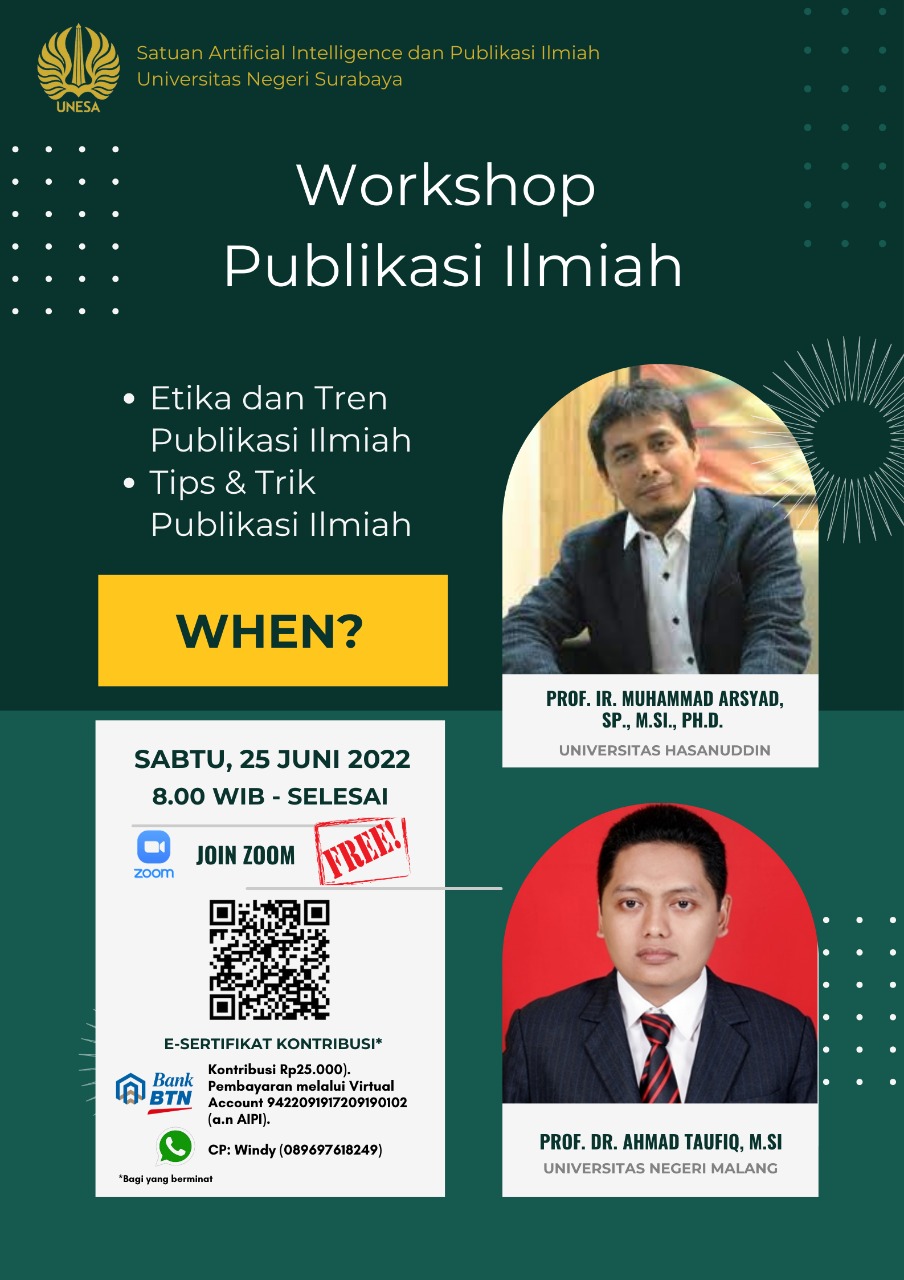 Satuan Artificial Intelligence dan Publikasi Ilmiah Universitas Negeri Surabaya menyelenggarakan Workshop Publikasi Ilmiah bagi mahasiswa dan dosen secara online yang dilaksanakan pada akhir pekan (Sabtu, 25/06/2022). Workshop ini membahas tentang Etika dan Tren Publikasi Ilmiah serta Tips dan Trik Publikasi Ilmiah.